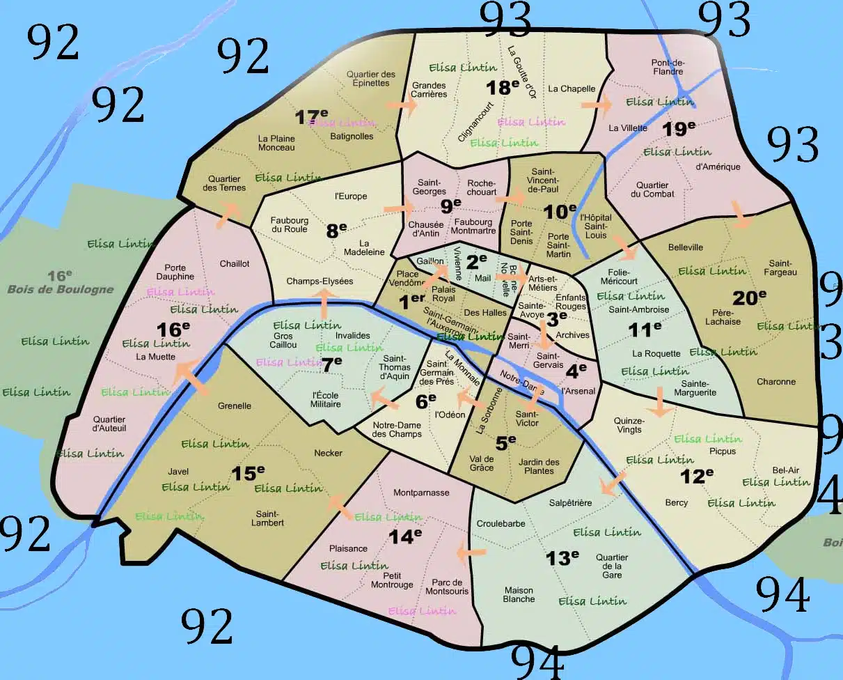 - Paris Rive Gauche : 5e, 6e, 7e, 13e, 14e, 15e (Quartier Latin, Saint-Germain, Tour Eiffel, Montparnasse).